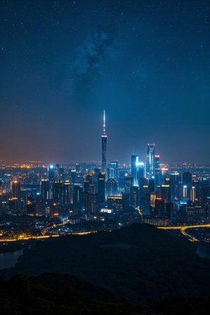 City night view of high rise buildings and starry sky overlooking the scene