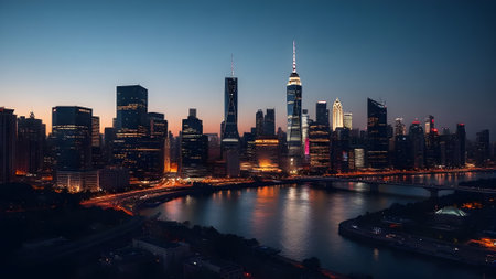 A skyline with illuminated bridges crossing a river, creating a stunning visual effect at night