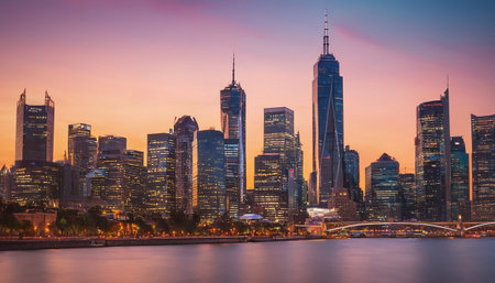 A breathtaking urban scene showcasing a vibrant city skyline illuminated by colorful lights against a dramatic twilight sky, perfect for travel and adventure themes.