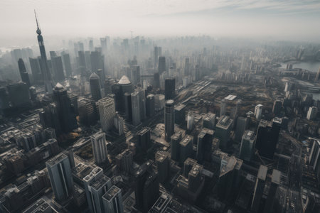 aerial drone shot of a busy city with skyscrapers in the backdrop, created with generative ai