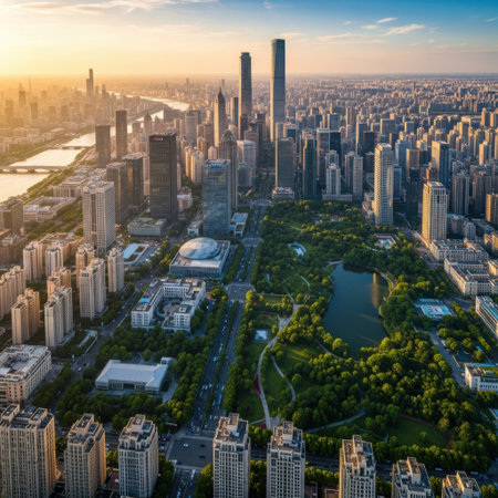 An expansive aerial view of a modern city at sunset, showcasing a dense collection of skyscrapers, a central park with a lake, and a river winding through the urban landscape.