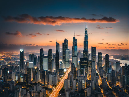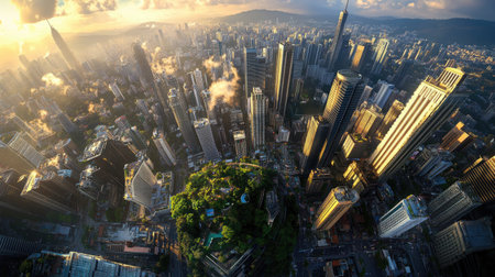 This stunning aerial image showcases a bustling urban landscape filled with towering skyscrapers, busy streets, and vibrant architecture during golden hour.