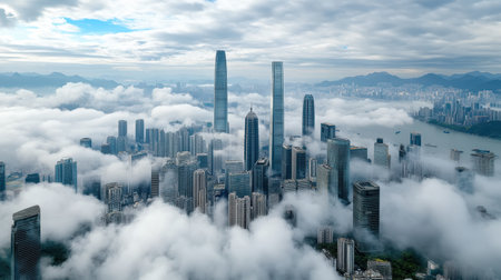 An Aerial view of city skyline surrounded by clouds and mountains