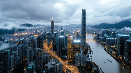An Aerial view of modern city skyline with skyscrapers and river