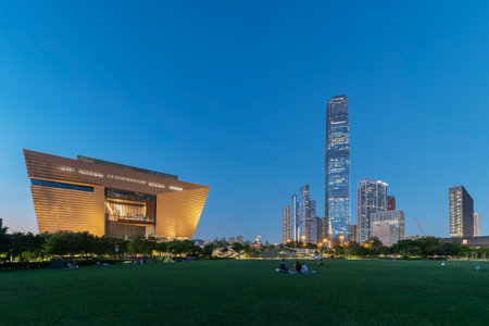 Scenery of West Kowloon Cultural District of Hong Kong city at dusk