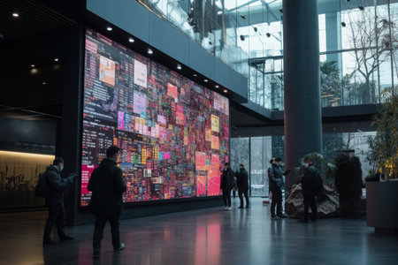 A bustling currency exchange center is filled with visitors as they gather around a massive digital screen displaying dynamic market data.