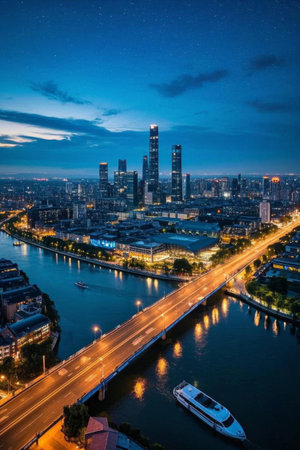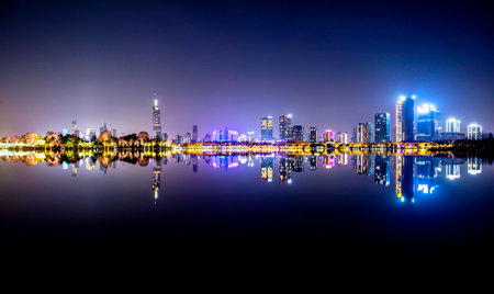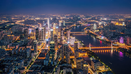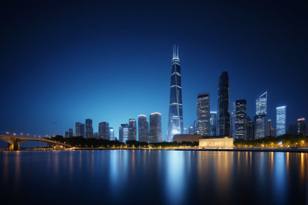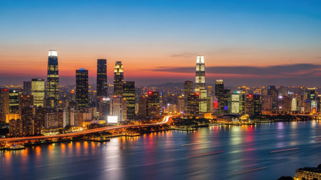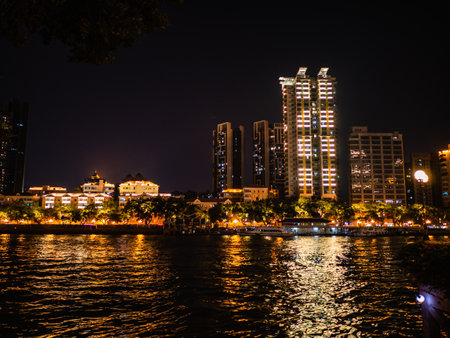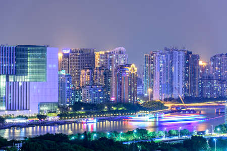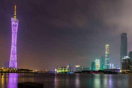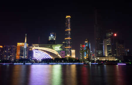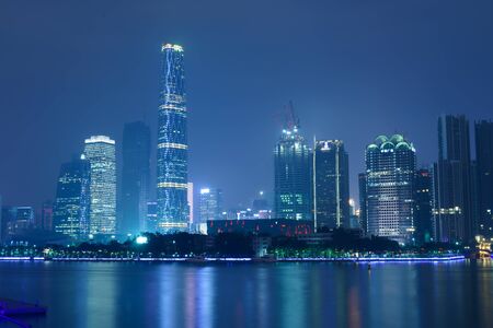Stunning view of the central business area of Guangzhou on the riverside of Zhujiang River with illuminated skyscrapers and reflection in water, Guangdong Province, China