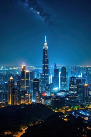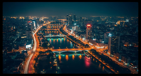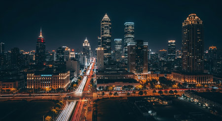 Stunning night view of a vibrant city skyline illuminated by bright lights and modern architecture, showcasing the energy and beauty of urban life.