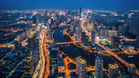Aerial view of Suzhou city at night, Jiangsu Province, China