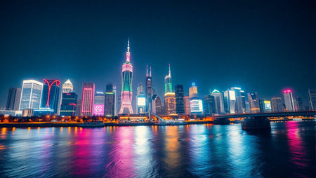 A stunning nighttime cityscape showcasing vibrant skyscrapers illuminated by bright lights, beautifully reflected on a serene river surface.