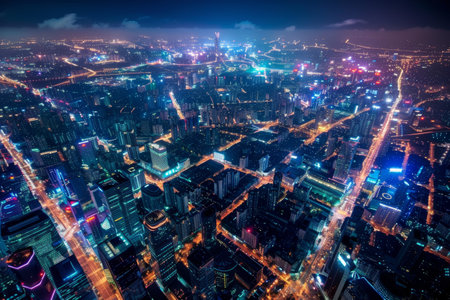 Aerial view of urban city at night in Shanghai,China.