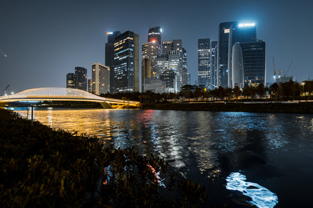 A stunning view of a modern city skyline at night, showcasing illuminated skyscrapers reflecting on calm waters. The vibrant blue hues create a serene atmosphere, perfect for urban exploration.