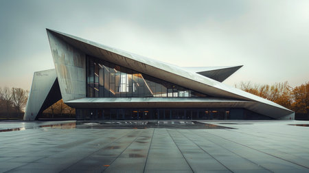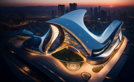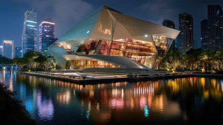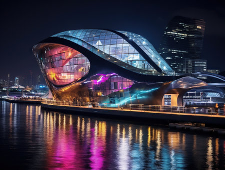 An architectural marvel is presented at night, showcasing a modern structure with fluid forms and reflective surfaces. The exterior features a metallic finish, with soft illumination highlighting the building's contours. The image captures the structure reflected in the calm waters. This image is suitable for various commercial uses, including promotional materials or artistic projects.