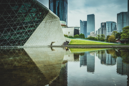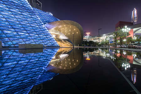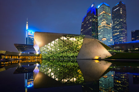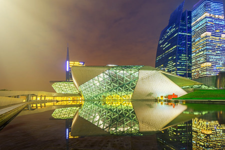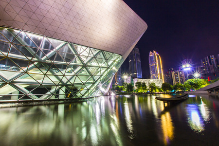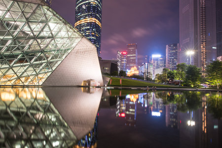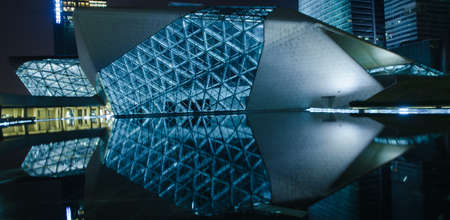 Night scenery of the Guangzhou Opera House with the reflection with water and city skyscrapers that have modern buildings at the Zhujiang New Town area.