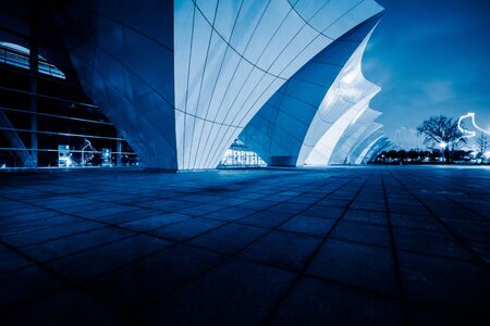 Modern opera house building illuminating riverfront at night in modern chinese city