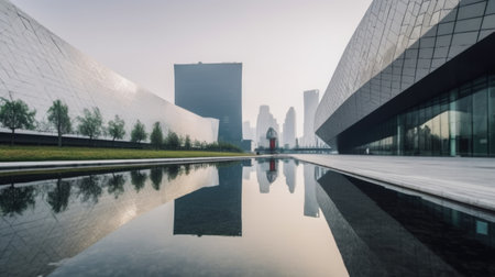 The exterior of a hall building reflected in a puddle with a backdrop of skyscrapers. Generative AI AIG21.