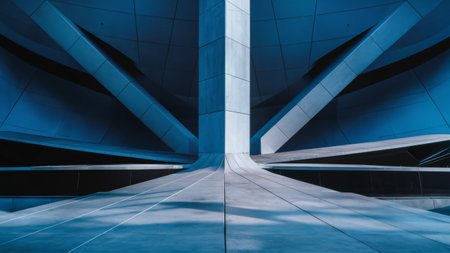 A stunning modern architectural design featuring sharp angles and glass walls, beautifully reflected in a water surface under a clear blue sky.