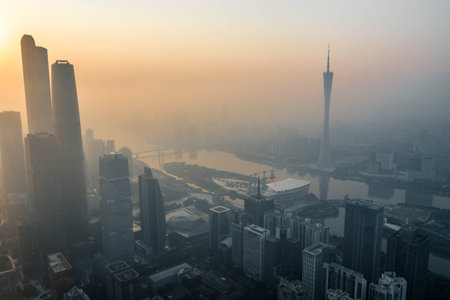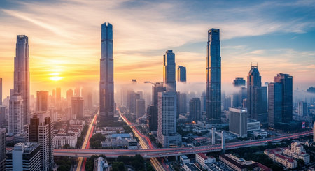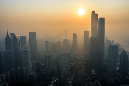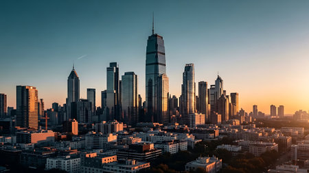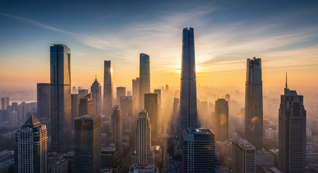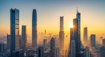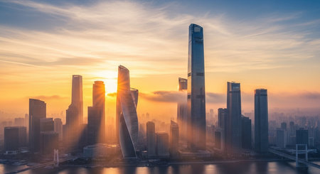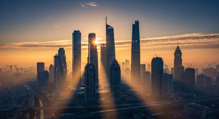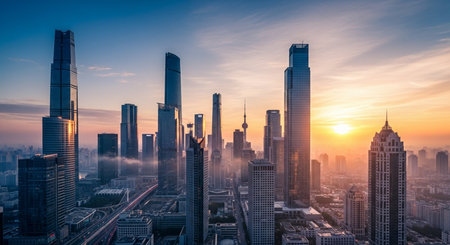 Aerial view of shanghai city skyline with skyscrapers at sunset