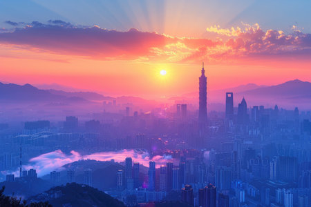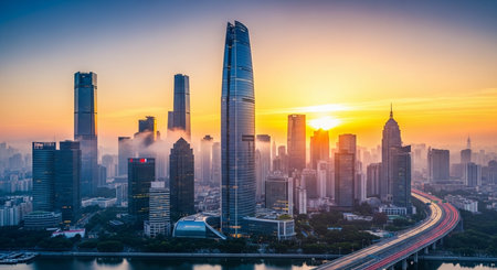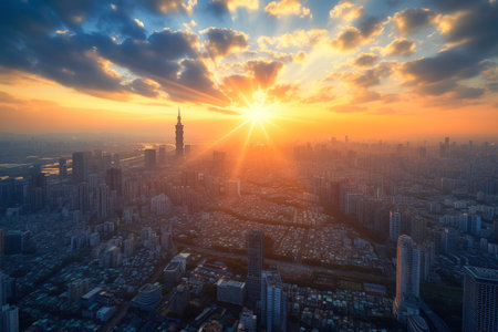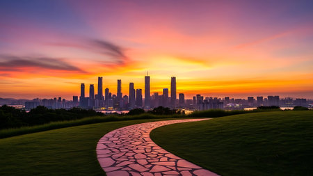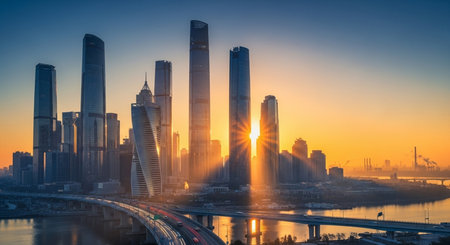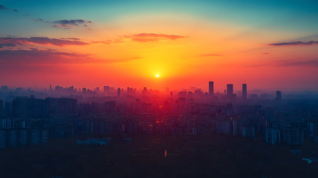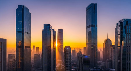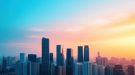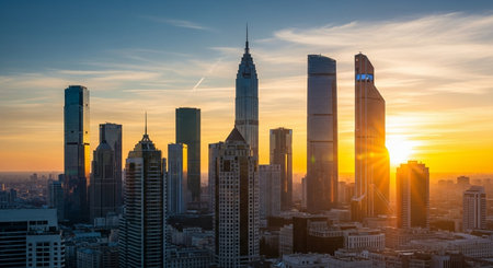 Stunning Sunset View Over Urban Skyline with Modern Skyscrapers Captured in Vibrant Colors of Blue and Orange