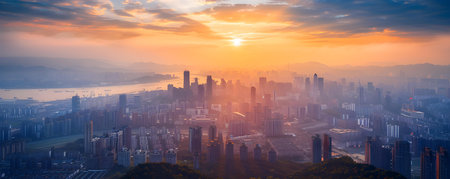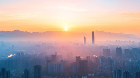 A panoramic view of the Chinese skyline at sunrise with mountains in the distance. No people, copy space.