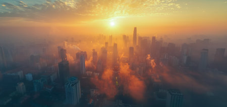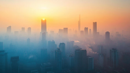 A city skyline with smog and haze due to ozone pollution, illustrating urban environmental challenges
