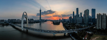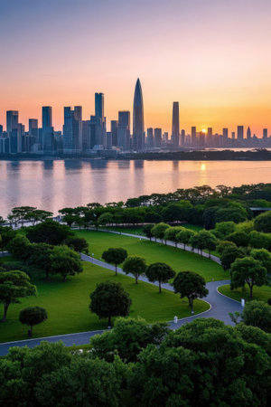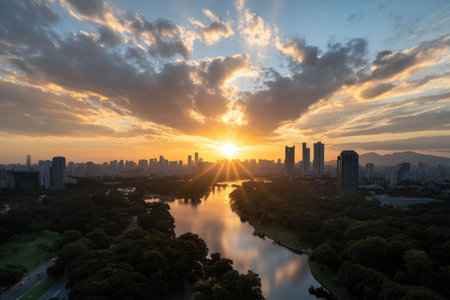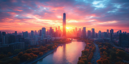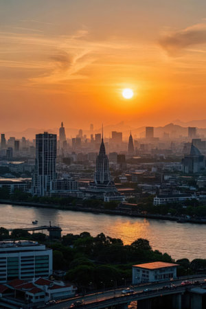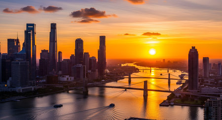 Breathtaking sunset casts golden hues over a sprawling city skyline along the river