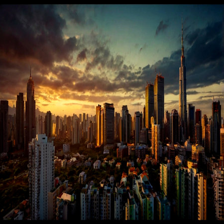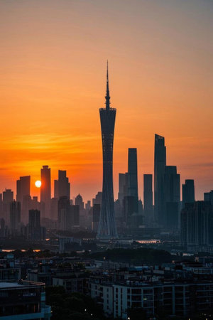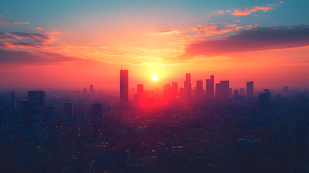 A stunning sunset paints the sky in orange and purple hues above a sprawling city. Skyscrapers stand tall amidst a bustling urban environment, creating a dramatic silhouette.