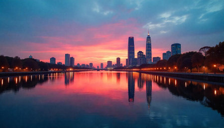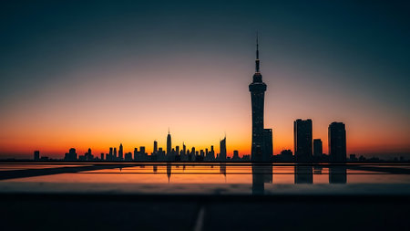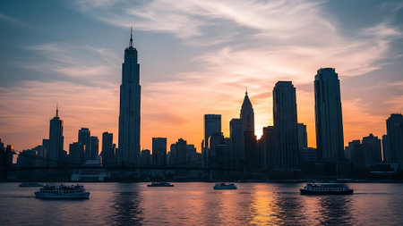 A serene city skyline at sunset, featuring towering skyscrapers silhouetted against a colorful sky.