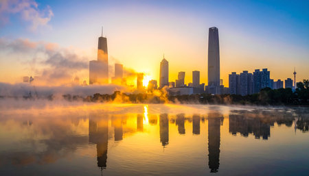 Shanghai skyline at sunrise with fog and reflection in the lake