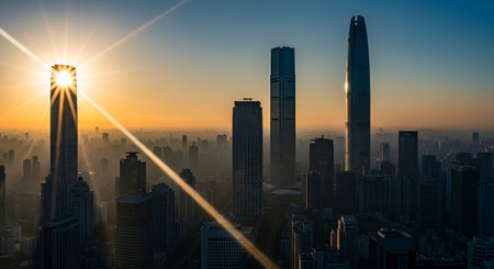 An aerial view of a sprawling city skyline at sunrise. The sun is positioned behind a tall skyscraper, creating a dramatic sunburst effect with visible light rays. Numerous modern skyscrapers of varying heights dominate the scene, with a hazy, orange-yellow sky in the background. The city below is shrouded in a light mist, adding to the atmospheric quality of the dawn.