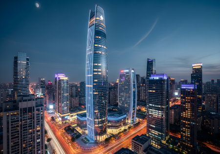GUANGZHOU, CHINA - NOVEMBER 7, 2015: Amazing night view of skyscrapers and other modern buildings at the Zhujiang New Town. Bottom view of the Guangzhou International Finance Centre on sky background.
