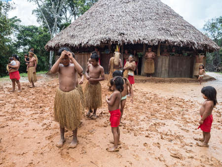 Iquitos, Peru- Dec 209: Yagua Indians in his local costume. Latin America. Yagua, Nativa Yahuas Comunidad.