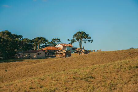 Wooden houses from farmstead on top of hill covered by pine trees and dry bushes near Cambara do Sul. A small country town in southern Brazil with amazing natural tourist attractions.