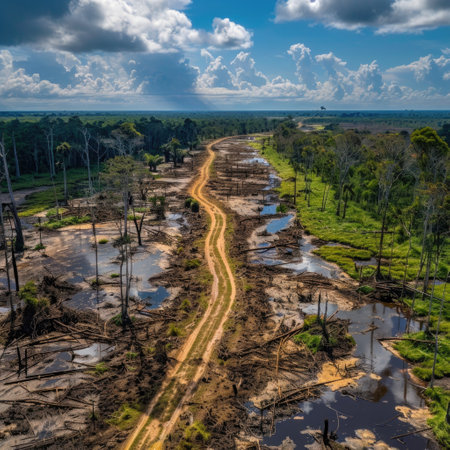 Drought-stricken Amazon landscape with cracked earth and sparse water reflecting climate change impact.