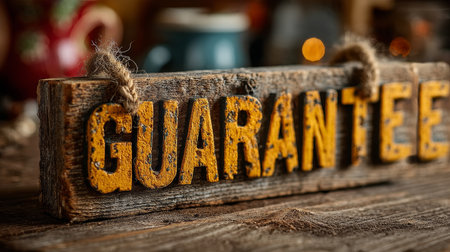 A vintage rustic sign with bold yellow letters spelling guarantee, suspended by rope on a worn wooden surface.