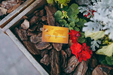 Close up credit bank yellow card on pieces of wood. Nature texture, brown wood background with red flowers for wallpaper. Finance design, currency concept. Copy space mock up sample. Advertising area