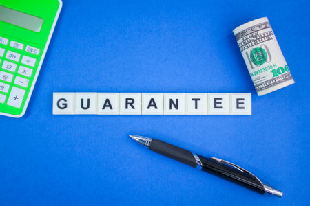 calculator, paper money and pen with the word guarantee. the concept of guarantee and warranty