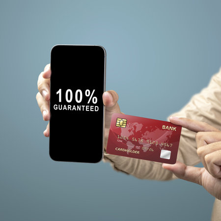 A person holds a mobile phone displaying a 100% guaranteed message next to a red credit card, representing secure digital payments, banking trust, and online shopping confidence
