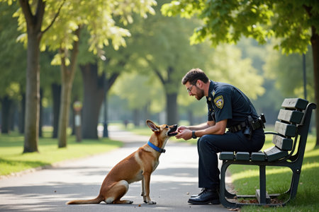 Medium shot of a narcotics detection dog alerting a handler during a security sweep highlighting teamwork and alertness in urban surroundings.
