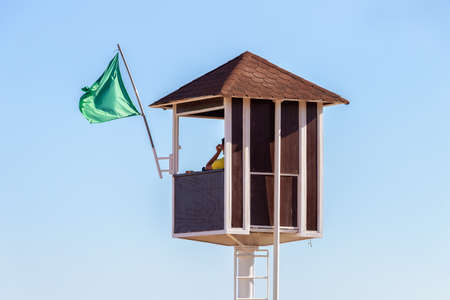 A lifeguard sitting on surveillance tower. Red wooden lifeguard tower