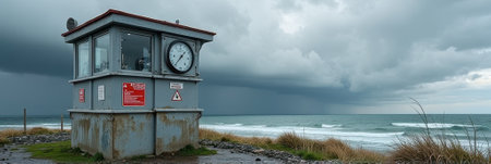 Coastal weather station with clock overlooking stormy ocean. That the image is generated using AI.
