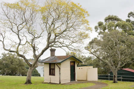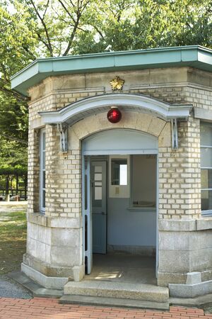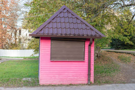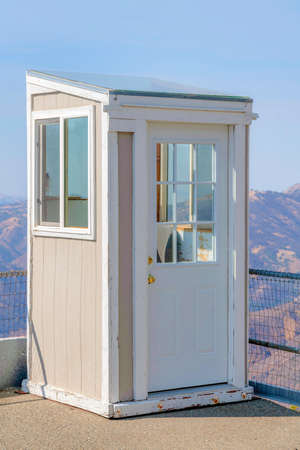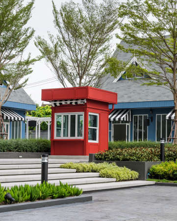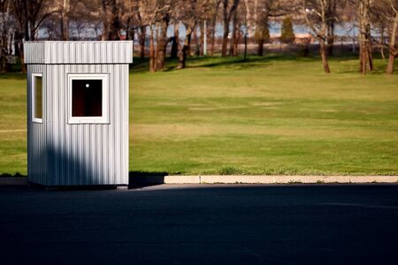 Security booth in the parking lot in the open area. photo. sun and shadow. green grass.