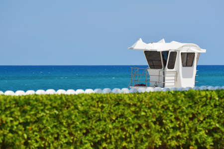 A lifeguard tower is visible under a cloudless blue sky. The tower structure is bright and located away from other buildings or activities.