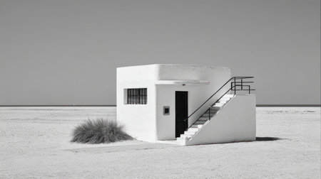 A stark, minimalist white building stands against a flat, monochrome landscape. The architecture features an exterior staircase and small windows. The image showcases a sense of isolation with its clean lines and contrasting shadows. Suitable for use in a variety of design and editorial contexts.