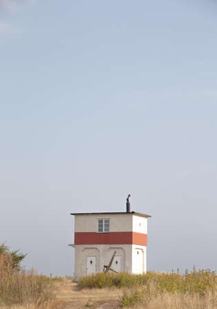 Beautiful landscape scenic view on Ontario lake in Canada. Overcast cloudy day with blue sky and clouds. Serene scene on desert beach with house booth cabin of lifeguards.