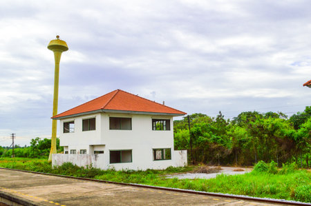 beautiful beach house with wooden bridge and radio communication post , grass on hill