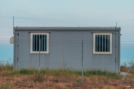 Industrial cabin residential container with glass windows on the Aegean sea shore in summer, selective focus