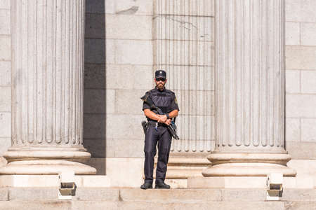 MADRID, SPAIN - SEPTEMBER 26, 2017: A policeman armed with a shotgun and body armor stands guard in front of the Congress of Deputies
