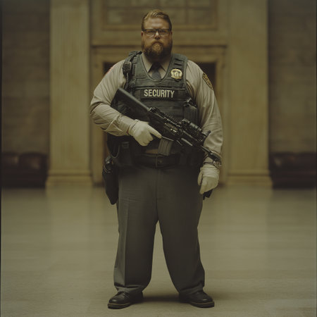 A man dressed in a security uniform holding a gun, prepared to enforce safety measures.