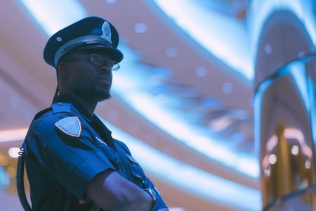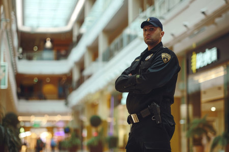 Security guard professional safety patrol man police employee mall safe business protect serve confident authority public space secure guarding agent staff shop convenience store grocery